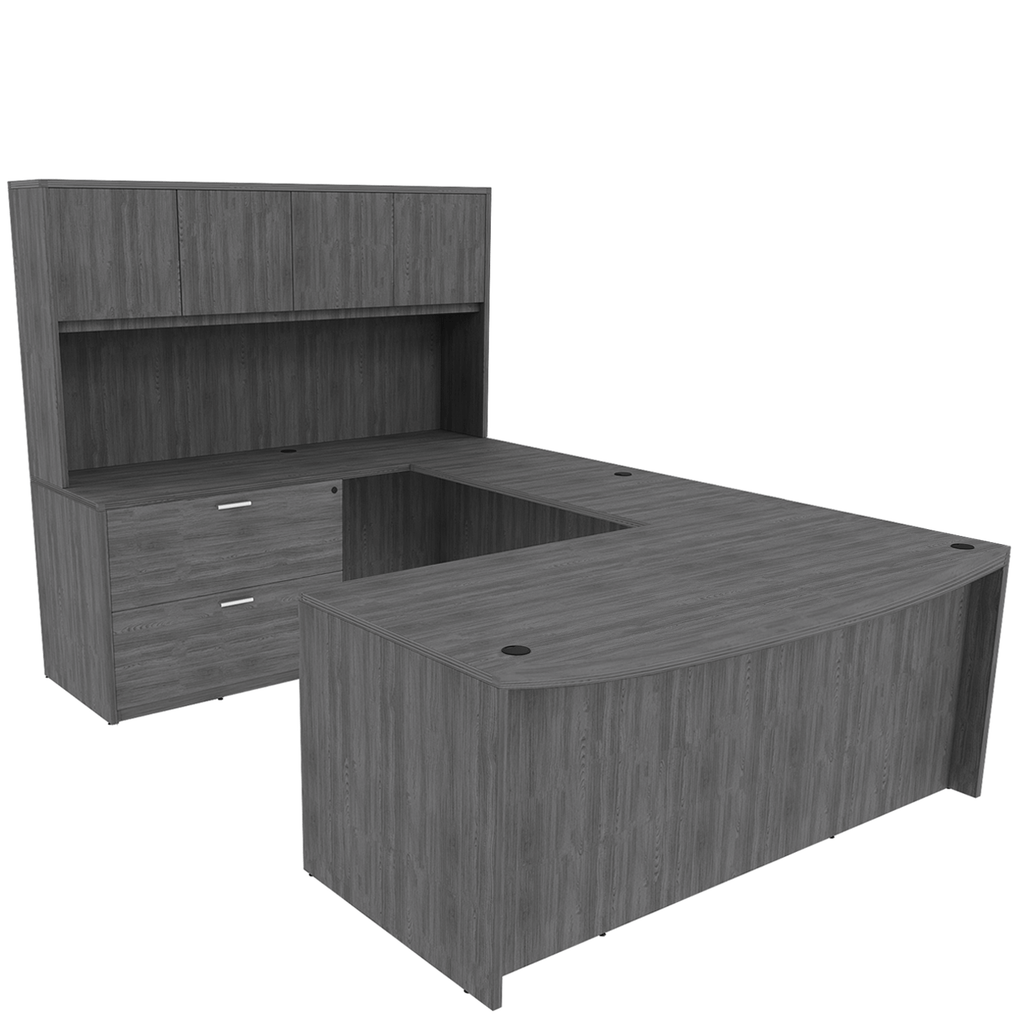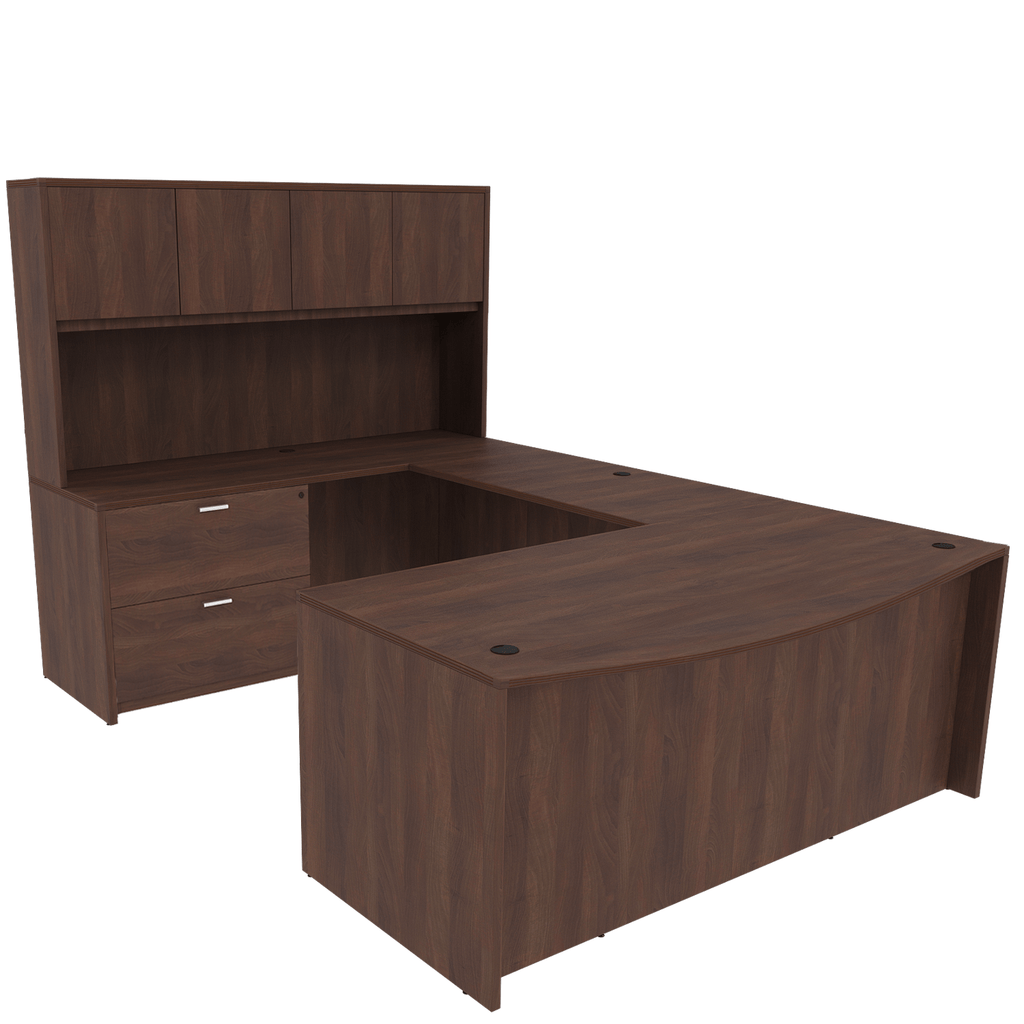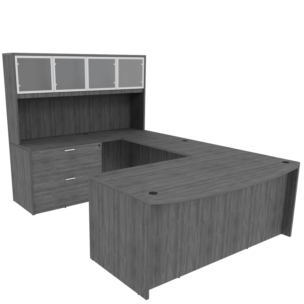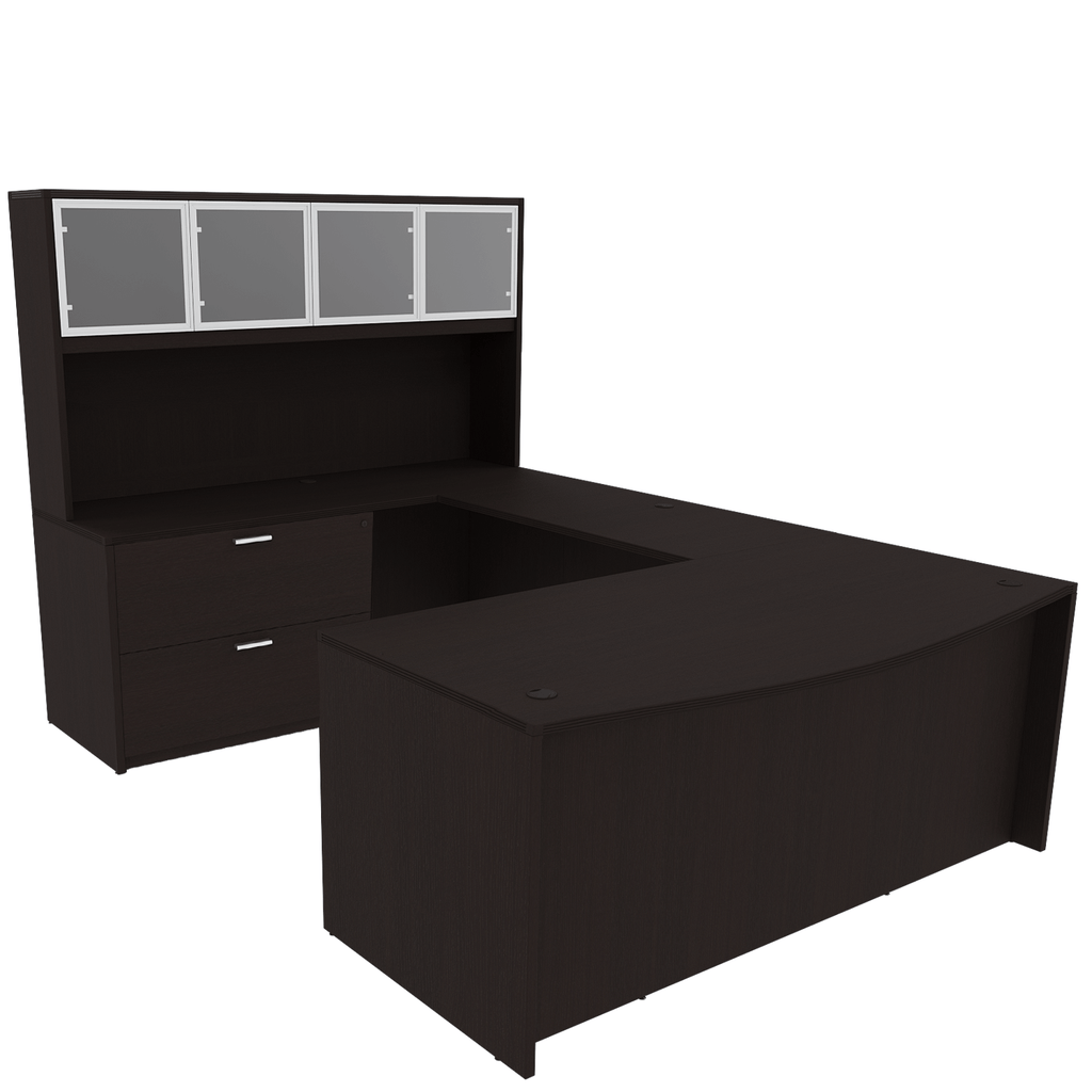 This specific U-shaped desk is both stylish and maximizes functionality, providing a full sized lateral pedestal for storage needs. It doesn't end there, the hutch also comes with 4 Doors to store smaller items or even to display items. Whether you look ahead, to the left, or to your right, this u-shaped piece has no shortage of desk space to lay out everything you need. The bowed front-end of the desk adds a more inviting touch for guests to join you in a conversation. Last but not least, the silver drawer handles add an elegant touch to perfectly compliment the laminate finish.